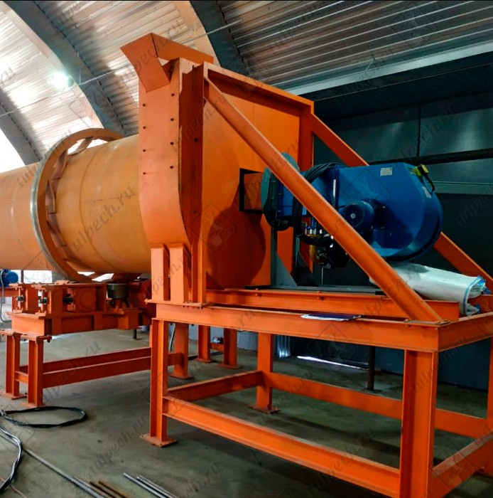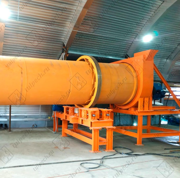 Сушильный барабан — основной рабочий орган, где происходит процесс удаления влаги. Конструкция включает металлический барабан с внутренними насадками, опорные бандажи, роликовые подшипники, венцовую шестерню привода и концевые камеры для загрузки и разгрузки.